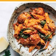 The base of this baby is a velvety, savory, garlic-heavy tomato and butter sauce, which is just the right amount of clingy for those hearty whole wheat penne noodles. And the meatballs, spinach, and Parmesan round the whole thing out into a one-and-done type meal.