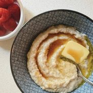 3. You’re Done! Yum! Stir in maple syrup and more water or milk if needed. Serve with butter on top, raspberries, and a drizzle of maple syrup if you want!