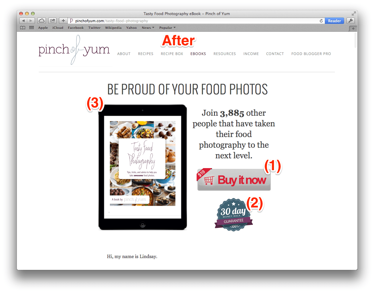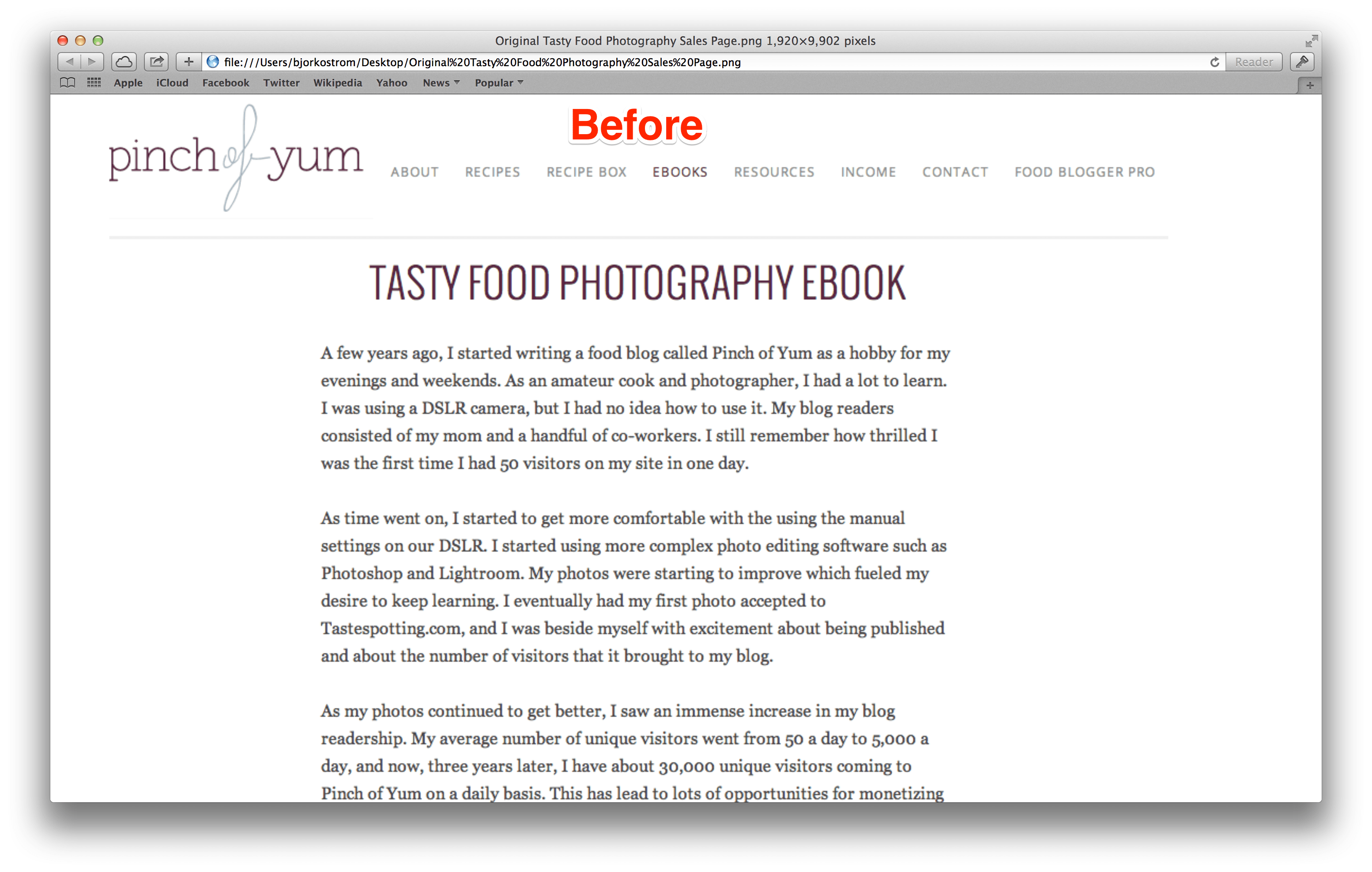 The two changes we made to strengthen our conversion coupling was to (1) change the header text of the landing page to read “Be Proud of Your Food Photos” and (2) include a cover image of the eBook.